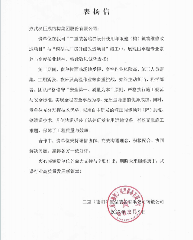2025年二重(德陽)重型裝備有限公司 表揚信
