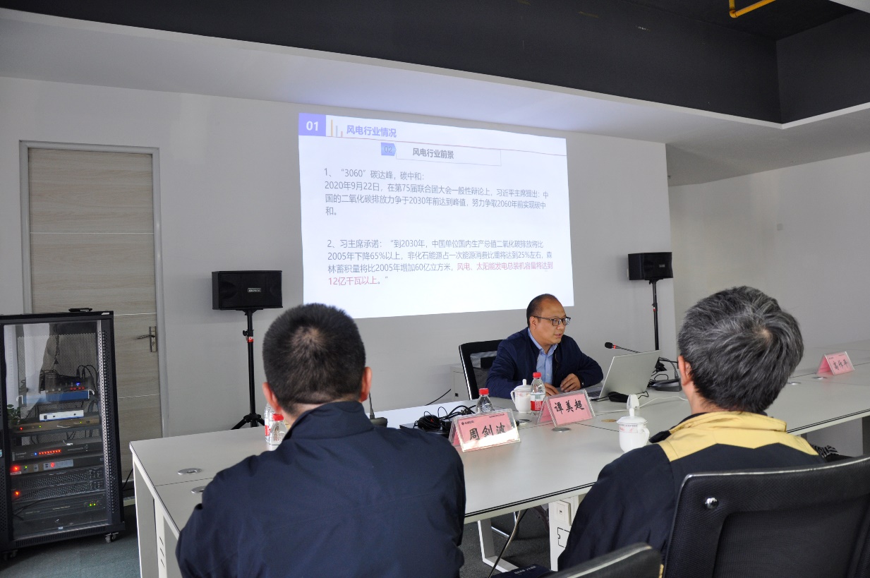 譚美超主任作了《風力發電交流》技術講座,主要包括風電行業情況、風機基礎、風機塔筒、風力發電土建研究方向、風力發電開發建設流程等,使全體員工對風力發電有了更多的了解。