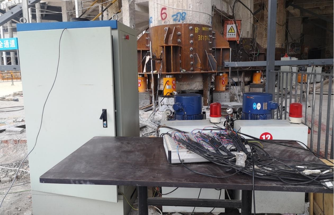 (2)同步頂升糾偏自動控制系統。鋼滑道同步頂升糾偏自動控制系統已獲得軟件著作權;該系統通過對工業芯片的集成使用,對位移控制的精度≤0.3mm,可以實現400-1000個點位的同步控制,可對每個點實現不同位移的頂升操作。本次工程應用該系統布置了64個點位的千斤頂,通過高精度的位移控制,確保頂升施工過程的安全可控。該系統不僅可以應用于建筑結構的頂升糾偏施工,還能進行建筑物頂升增層施工。