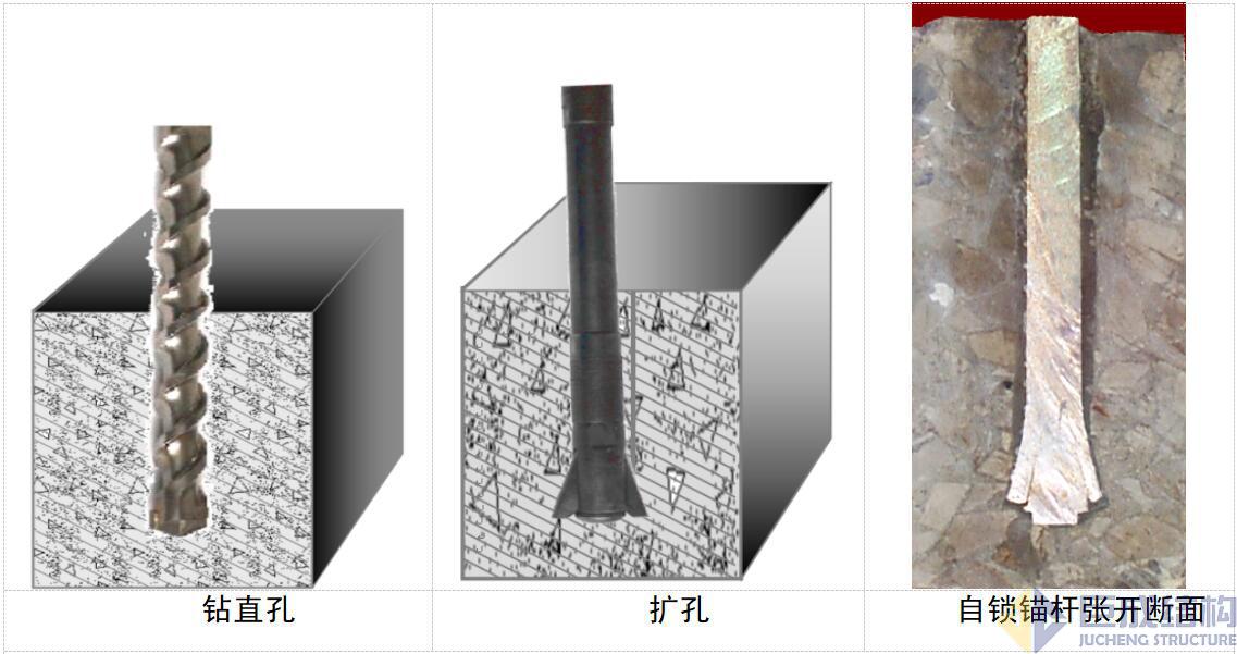 擴孔自鎖錨固技術的工藝是先鉆直孔,再使用擴孔鉆頭在孔底擴孔,然后注入無機注漿料,再將自鎖錨桿插入孔中,通過加壓或沖擊使錨桿在孔底張開形成機械自鎖。