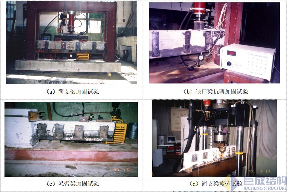 二十年來,巨成結構科研人員對粘接型鋼加大截面加固法開展了相關理論分析、力學性能試驗研究和數值分析,包括粘接型鋼加大截面加固簡支梁抗彎試驗研究、粘接型鋼加大截面加固缺口梁端部抗剪試驗研究、粘接型鋼加大截面加固懸挑梁抗彎試驗研究、粘接型鋼加大截面加固簡支梁重載疲勞試驗研究、粘接型鋼加固混凝土板試驗研究等(如圖4),取得了豐富的研究成果,具有理論、試驗研究分析和大量實際應用基礎。