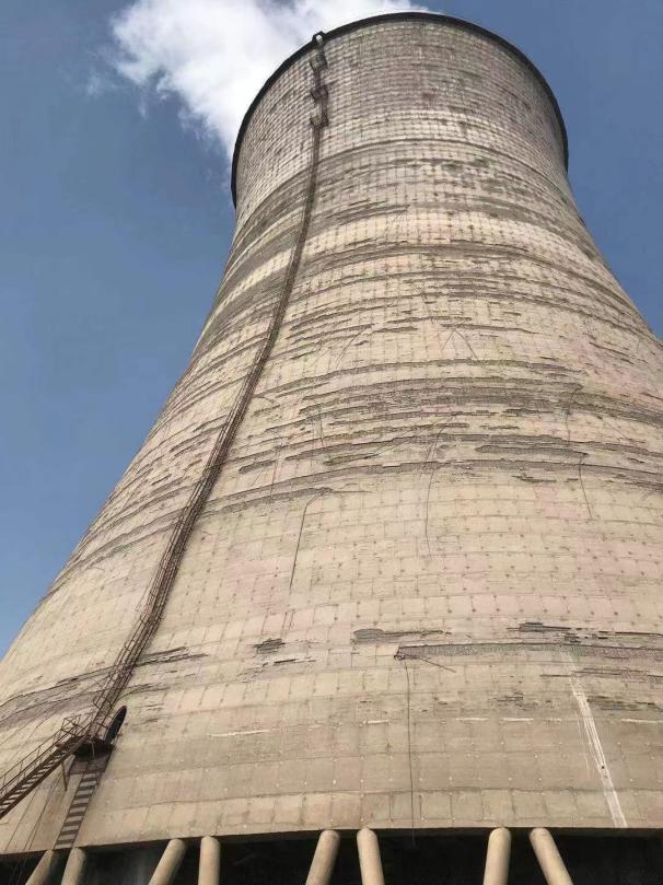 山東天源熱電有限公司三電廠2#冷卻塔,隸屬世界五百強印尼“金光集團”。項目位于山東淄博,2011年投入使用,淋水面積5500㎡,總高度為115.00m。加固改造前因結構嚴重破損,被當地建設管理部門責令立即處理。考慮到重建投資高,程序復雜,業主決定加固改造。為高質量完成改造任務,業主面向業內的全國優秀企業進行招標。巨成憑借豐富的經驗業績、突出的技術方案、嚴密的施工組織、科學的安全保障拔得頭籌。