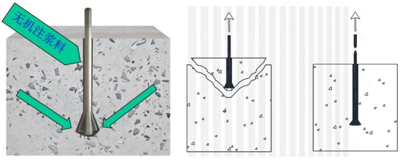 擴孔自鎖錨桿只有兩種破壞形式,不會發生化學植筋中的滑移破壞。自鎖錨桿的優點是:底部擴大形成機械咬合提供錨固力,錨固深度更淺;灌注無機注漿料,不懼溫度和濕度的影響,耐久性與被錨固體一致,克服了化學植筋不耐高溫、不耐潮濕以及耐久性差的問題。