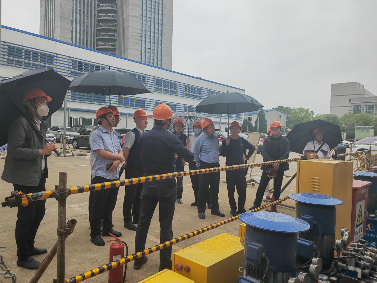 在巨成鋼滑道群控同步頂升工程試驗項目現場,研究院院長助理周志勇對鋼滑道群控同步頂升試驗的背景和目的進行了介紹,對該技術的安全性、高效性、經濟性等特點進行說明,雙方在應用場景方面進行了探討和交流。