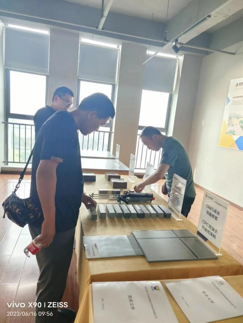 來賓參觀了正在進行的巨成鋼滑道群控同步頂升工程試驗項目現場,并參觀四樓展廳,了解了巨成的發展歷程和重要業績,重點了解巨成水工材料如抗沖耐磨材料、清水涂料等創新性材料。總經理萬雄衛對小三峽技術人員的到來表示熱烈歡迎,重點介紹了巨成在水電、水利行業的業績,如丹江口水庫、二灘水電站、觀音閣水庫等加固和涂裝美化工程。小三峽的技術人員表示,以前小三峽本水電站也遇到過許多類似的問題,今后雙方在該領域可以有很多的合作。就小三峽提出的具體問題,總工程師周劍波仔細研究了圖紙,與對方進行了交流,并給出了相關建議。