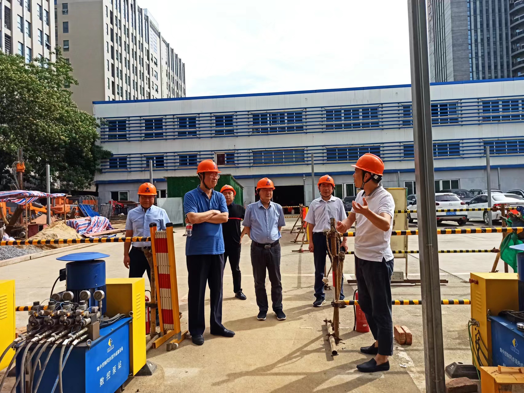 梅院長一行首先來到巨成群控同步頂升工程試驗項目現場,巨成研究院院長助理周志勇介紹了頂升試驗的背景、目的和技術方案。雙方就鋼滑道頂升技術對砌體結構頂升增層的設計方法和施工技術展開了交流和討論,特別是對托盤梁的受力模型進行深入探討。大家一致認為巨成鋼滑道頂升技術能夠在城市更新、老舊小區改造等領域發揮重大作用。