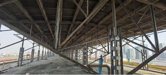 獲獎(jiǎng)代表周志勇,現(xiàn)在正在四川德陽中國二重裝備集團(tuán)鑄鍛公司車間改造項(xiàng)目現(xiàn)場(chǎng),介紹了二重項(xiàng)目巨成科技的創(chuàng)新應(yīng)用。該廠房開展環(huán)保改造,主要內(nèi)容包括屋面板更換、天窗架降低高度等。但由于該廠房規(guī)模大(308m×82m×35m),且周邊均建有相關(guān)建筑,屋面板無法采用吊車拆除和更換,天窗架更是不能采用吊車開展拆除和新建,巨成公司應(yīng)用兩個(gè)創(chuàng)新技術(shù)將其完美解決,并大大降低了成本、節(jié)約了工期。其一,是研發(fā)了大型工業(yè)廠房屋面板軌道拆裝成套設(shè)備,對(duì)大屋面和天窗架上的屋面板進(jìn)行拆裝。其二,是利用鋼滑道頂升技術(shù)對(duì)天窗架實(shí)施整體頂降,天窗架長(zhǎng)228m、寬18m、高5.45m,我們?cè)?5m高度的屋面上對(duì)其進(jìn)行同步頂降施工,將天窗架整體下降1.945m,目前已經(jīng)完成了天窗架頂降的各項(xiàng)準(zhǔn)備工作,計(jì)劃于12月30日正式頂降。這是國內(nèi)外大型工業(yè)廠房天窗架整體頂降的首例工程。