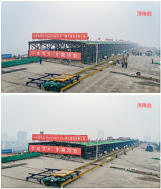 巨成公司成立了頂降專項工程指揮部,經過周密部署和精心設計,歷時11個階段,27小時奮戰順利將天窗架整體頂降1.945m。這是利用創新技術解決工程難題的典型案例,創造了大型工業廠房(長度達228m)整體頂降的巨成新紀錄!